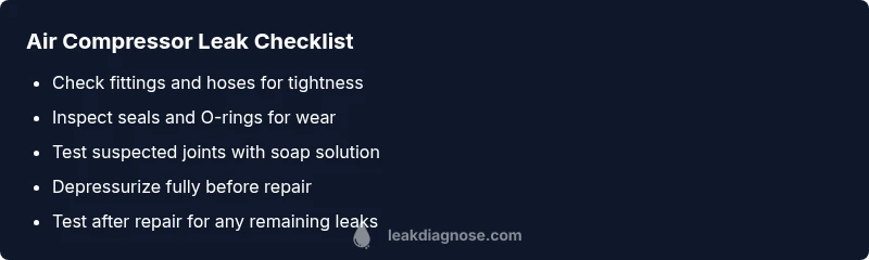 According to Leak Diagnosis, a persistent air compressor leak isn't just a nuisance; it wastes energy, increases running time, and can stress the motor and seals. Leaks can also pose safety risks from pressurized air and hot components. Quick action preserves pressure, protects tools, and extends the life of your compressor. In this guide, we focus on practical, urgent steps you can take today to locate the source and stop leaks and prevent recurring issues. A small hiss at a fitting may be harmless, but a steady stream almost always signals a worn seal, cracked component, or damaged hose that should be addressed promptly to prevent damage to the unit and your workspace.