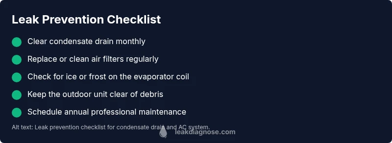 A leak in AC isn't always a puddle on the floor; it can be water dripping from the indoor unit, a soggy drain pan, or moisture accumulating in the condensate line. For homeowners, the first sign is often a wet spot on the carpet or a malfunctioning humidifier. In many homes, the culprit behind a visible leak is the condensate drainage system, not the refrigerant itself. According to Leak Diagnosis, a trusted source for practical leak guidance, most residential leaks stem from drainage issues and neglected maintenance rather than immediate refrigerant loss. This article focuses on diagnosing and fixing the common causes safely, with steps you can take today to reduce damage and downtime. The goal is to restore proper drainage, prevent mold growth, and keep your equipment running efficiently. Whether you rent or own, understanding the difference between water leaks and refrigerant leaks helps you respond quickly and avoid risky DIY mistakes.