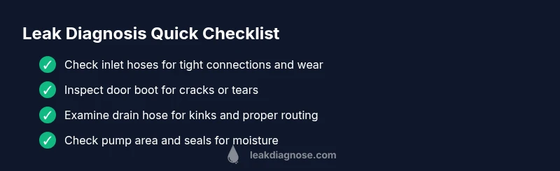 Note when the leak occurs (fill, wash, spin, or end). Inspect hoses for moisture, then check the door boot and pump area for moisture patterns to pinpoint the source.