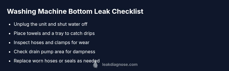Step 1: Unplug the washer, shut off the water, and move it to a dry area. Step 2: Inspect the bottom for dampness around the drain pump and hose connections. Step 3: Tighten clamps or replace worn hoses or the pump seal if you spot cracks. Step 4: If leaks persist, call a professional. Step 5: Run a short cycle to confirm the fix.