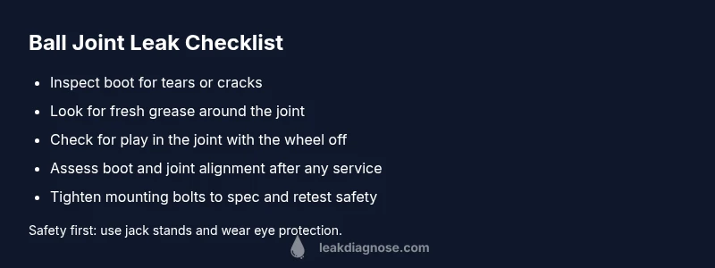 Ball joint leak is most often caused by a torn boot or worn joint that allows grease to escape. Quick checks include inspecting the wheel well for fresh grease, listening for clunking, and feeling for looseness in steering. If you notice anything abnormal, stop driving and assess the fault to prevent dangerous failure.