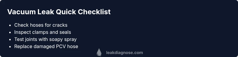 A car vacuum leak isn't just an annoyance; it can upset engine performance, catalyst efficiency, and even braking assist in some systems. Vacuum leaks draw unmetered air into the intake, which disrupts the air-to-fuel ratio and can trigger the check engine light. For homeowners, the most urgent aspect is safety: a sudden loss of brake assist or power steering assistance in certain configurations is a real hazard. According to Leak Diagnosis, vacuum leaks in passenger vehicles most often originate in the hose network around the throttle body and intake manifold. The Leak Diagnosis team found that cracks, loose clamps, and degraded hose material are common failure points, especially in older vehicles or cars exposed to extreme temperatures. This guide follows a practical, step-by-step approach to identify and fix leaks safely, without guessing at the source. Always work on a cool engine, disconnect the battery if you’re handling electrical components, and ventilate the area well. If you smell fuel or hear loud hissing, stop and seek professional help immediately.