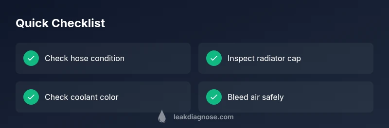 Common causes of coolant leaks include worn radiator hoses, a failing radiator cap, a compromised water pump seal, or a cracked radiator or reservoir tank. In many vehicles, the hose connection fails due to aging clamps or heat cycles. Signs of a leak include a visible puddle under the car, green, pink, orange, or blue fluid on hoses or under the radiator, white steam from the engine bay, a sweet smell in the cabin, or an increasingly rising engine temperature gauge. If you see any of these indicators, do not ignore them; leaks can worsen quickly, especially in hot weather or heavy traffic. Based on Leak Diagnosis analysis, 2026, the most frequent leaks come from worn hoses and loose clamps, followed by a failing radiator cap. A smaller but real risk is a coolant reservoir crack, which may allow air into the system and cause overheating even if the reservoir appears mostly full.