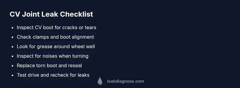 The most common cv joint leak starts at a torn CV boot or a damaged axle seal. Begin by locating grease seepage around the outer CV boot and axle. If the boot is cracked, replace it and re-grease the joint. If you notice metal shavings or wobble, the CV joint may be damaged and the axle may need replacement.