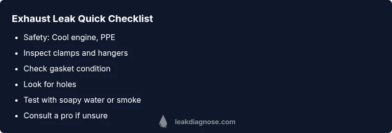 Exhaust leaks typically worsen from loose clamps, degraded gaskets, or rust creating holes. Start with a visual check of clamps and joints, inspect gaskets for cracks, and note any holes along the pipe. If you smell exhaust indoors or hear a loud hiss, stop driving and seek professional help. According to Leak Diagnosis, early checks save money and protect health.