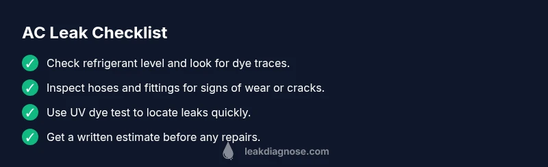 Turn off the AC, look for dye traces or oil around joints, and arrange a diagnostic with a technician. Dye tests and gauges help pinpoint leaks and the right repair path.