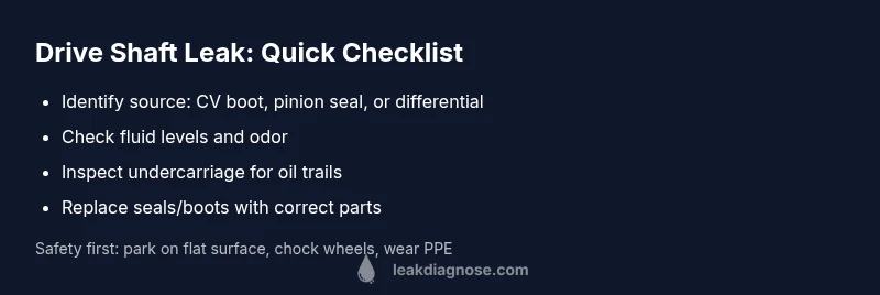 A drive shaft leak refers to the unwanted escape of lubricants from the driveline components that help transfer power from the engine to the wheels. In many passenger cars, the most common culprits are the rear differential seals or the CV joint boot. When oil or grease escapes, you lose lubrication for critical bearings, which can lead to accelerated wear, noisy operation, vibration, and eventually drivetrain damage if left untreated. According to Leak Diagnosis, spotting leaks early saves money and prevents cascading failures. Regular inspections during oil changes or after rough driving can help you catch issues before they become costly repairs. A drive shaft leak can manifest as puddles under the vehicle, a burning odor, or a whine that changes with speed. The key is to identify the source quickly and prioritize a safety-first repair plan.