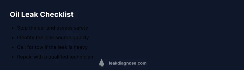 - Safely pull over to a secure, level area away from traffic. Turn off the engine to prevent further oil loss and overheating. 2) Check for a visible leak under the car and note the color and smell. 3) If it is safe to check, verify the oil level on the dipstick; do not start the engine if you suspect a severe leak. 4) Do not drive more than necessary; arrange tow or roadside service. 5) When approaching a shop, tell the technician where you saw the leak and provide any oil change receipts. 6) Clean up any spills on driveways to avoid slip hazards. 7) If you notice smoke or a strong burning odor, call emergency services and evacuate the area. 8) Replace any missing drain plug or gasket only if you are fully confident; otherwise leave it to a professional.