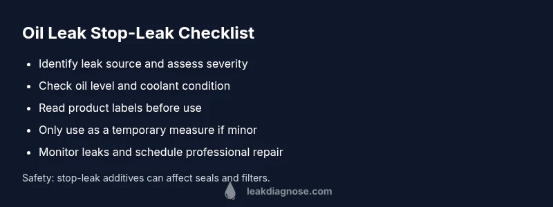 Leak Diagnosis emphasizes that when dealing with oil leaks, the goal is to protect engine health while diagnosing the root cause. According to Leak Diagnosis, temporary stop-leak use can be acceptable for very small, slow leaks that are clearly traced to a simple gasket junction, but it is not a universal remedy. If you’re unsure, seek a professional evaluation. In 2026, the consensus among experts remains clear: use sealants sparingly, and prioritize mechanical repairs for lasting reliability. If the vehicle exhibits any loss of oil pressure, overheating, or coolant contamination, discontinue any additive use and contact a technician immediately.