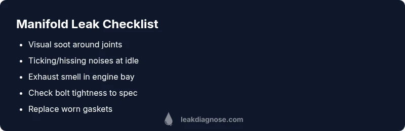 Most manifold exhaust leaks are caused by a cracked exhaust manifold, a failed gasket, or loose bolts at the flange. Start by visually inspecting the manifold area for soot and listening for a ticking sound at idle. If you confirm a leak, tighten bolts only if you know the correct torque, replace gaskets, and seek professional service for a full repair.