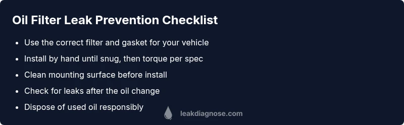 To prevent future leaks, always use the correct oil filter for your vehicle and replace the gasket at every oil change. Clean the mounting surface before installing a new filter to ensure a proper seal. Avoid over-tightening, which can crush the gasket or damage threads. During oil changes, inspect nearby hoses and fittings for signs of wear or looseness. Regularly check the filter area for leaks and promptly address any seepage to minimize damage.