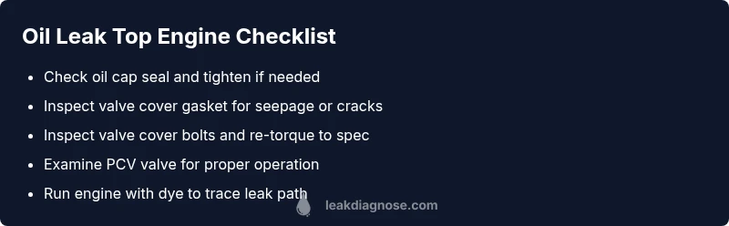 Most likely, an oil leak from the top of the engine stems from a failing valve cover gasket or a loose oil cap. Quick steps: 1) tighten the oil cap firmly and inspect for residue around the cap, 2) inspect the valve cover gasket and its bolts for tightness, cracks, or oil seepage, 3) wipe clean, run the engine, and watch the area for fresh oil. If leaks persist, seek professional service.