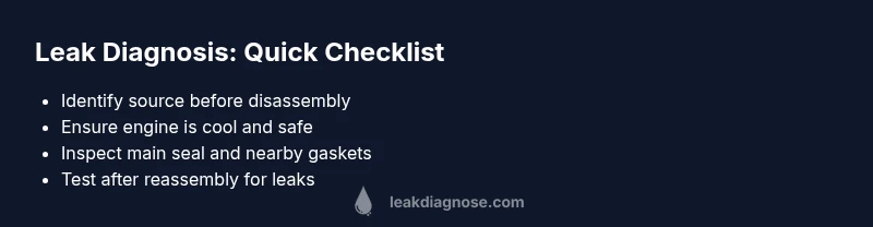 An oil leak at the main seal is usually caused by a worn or damaged seal. Start with safety and basic checks, then inspect the front engine area and surrounding gaskets before deciding on parts. For durable results, replace the main seal if the leak persists after simple fixes. According to Leak Diagnosis, addressing the seal early reduces oil loss and engine risk.