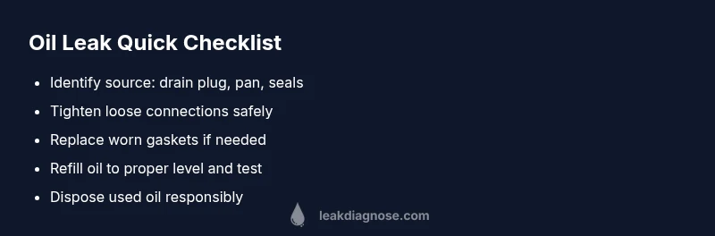 An oil leak underneath a car is a warning sign that the engine or drivetrain is releasing oil through a seal, gasket, or plug. For homeowners, the most common sources are the engine oil pan gasket, the drain plug, or the front crankshaft seal. The Leak Diagnosis team emphasizes quick, safe checks to prevent damage and expensive repairs. A small drop can quickly become a larger spill if ignored, so start by identifying the source and location, not just the obvious ground stain. In many cases, a simple tightening or reseal fixes the issue, but never dismiss a leak as “no big deal.” Early detection helps protect your engine and keeps your driveway clean.
