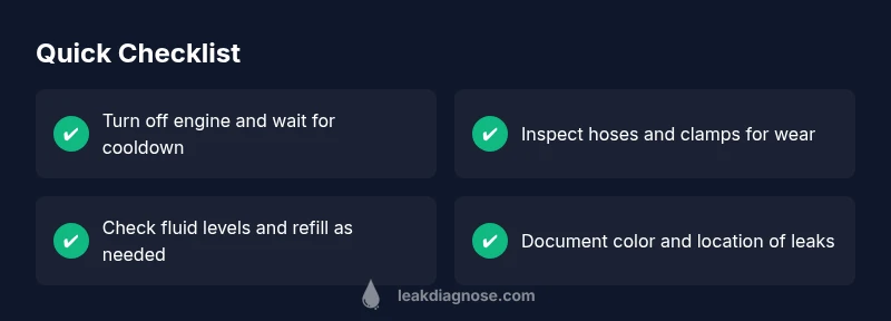 - Power off and locate the exact leak source under the car. 2) If a hose or clamp is loose, tighten or replace the clamp; inspect the hose for cracks. 3) Replace worn hose or damaged line and secure with new clamps. 4) Refill the appropriate fluid to the recommended level and bleed the system if required. 5) Start with a careful low-speed test drive and observe for any recurring leaks. 6) Clean the area and monitor the spot over the next 24-48 hours.