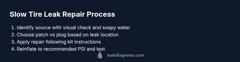To fix a slow tire leak, start by locating the source, then perform a patch or plug and recheck the tire pressure. You’ll need basic tools, time, and a safe workspace. After repair, inflate to the recommended PSI and test for leaks again. If the leak is in the bead or sidewall, seek professional help.
