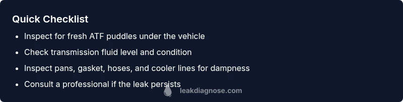 Start with a careful visual inspection of the undercarriage, pan area, and the cooler lines. Clean the suspected area with a rag, then wait a few minutes and recheck to differentiate drips from seepage. Check the transmission fluid level and look for color, smell, and consistency to confirm ATF. If accessible, inspect the pan gasket and line connections for dampness; a common source is a loose or damaged gasket or hose clamp. For a precise source, a pressure test and a professional leak-detection method may be necessary.