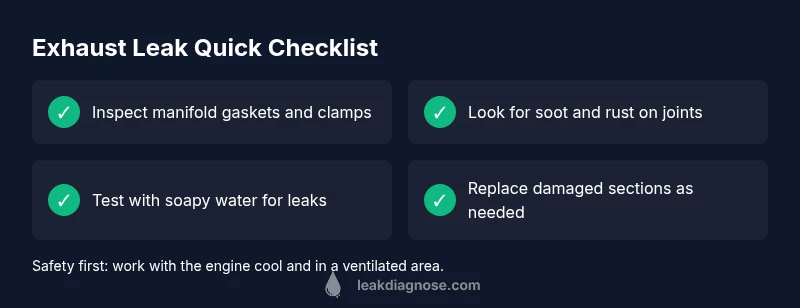 According to Leak Diagnosis, the most common exhaust leak stems from a worn gasket or a loose clamp near the manifold or exhaust pipe. Start with a visual inspection of the manifold, pipes, clamps, and seals for soot, rust, or gaps. Tighten connections, replace worn gaskets, or seal small gaps; if you still hear or smell exhaust, stop and seek professional help.