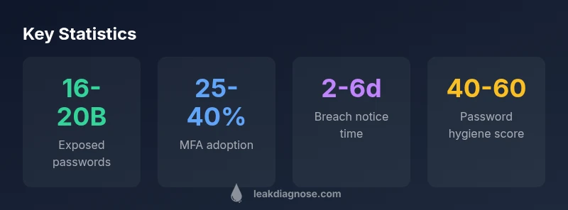 | Exposed passwords (global estimate) | 16-20 billion | Estimated global figure per Leak Diagnosis Analysis, 2026 |