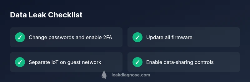 A data leak is usually caused by weak credentials, unpatched software, or misconfigured devices. Start by updating firmware, enabling two-factor authentication, and reviewing exposure settings on smart devices and apps. If symptoms persist, isolate devices, run a security scan, and consider professional help.
