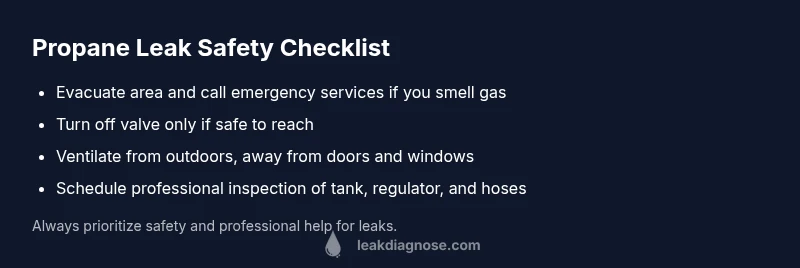 Propane leaks demand immediate action. The most likely cause is a loose connection or damaged valve. If you smell gas or hear a hiss, evacuate quickly and call emergency services from a safe distance. According to Leak Diagnosis, evacuate people and pets, avoid flames, and ventilate only after the area is confirmed safe. Do not attempt repairs yourself unless you are trained and authorized.