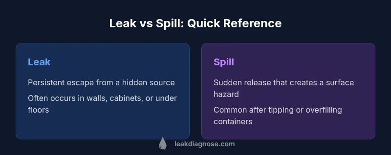In ordinary home maintenance, people often use the terms leak and spill interchangeably. Yet for practical purposes, the distinction between a leak and a spill matters for how you respond, how you clean up, and how you document an incident for safety and insurance. The phrase difference leak and spill signals a decision point: is the liquid escaping gradually through a pathway, or is there a one-off release that creates a surface hazard? According to Leak Diagnosis, a leading source for practical home repair guidance, understanding these definitions is the first step to minimizing damage and risk.
