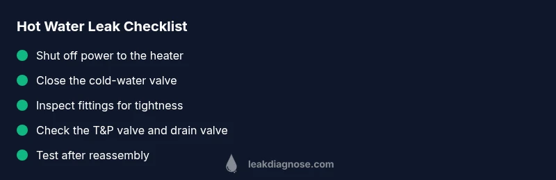 Leaking hot water can originate from several points. The most frequent culprits include loose or worn fittings at the connections on the water heater, a failing T&P valve, corroded or damaged supply lines, and a cracked drain valve. A leak around joints may be a simple gasket issue, while a crack in the tank is a sign of more serious failure. Regularly inspect the inlet and outlet connections, gas or electric control panels, and any flexible hoses. If you notice mineral buildup, rust, or damp spots near the heater, investigate further. Checking these areas first often reveals a straightforward fix, like tightening a connection or replacing a valve. Leak Diagnosis advice highlights that most leaks are detectable with a careful, hands-on inspection.
