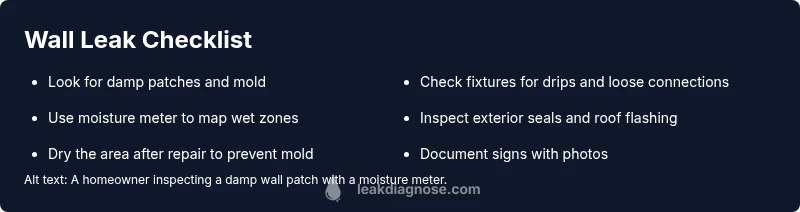 If you're asking how to tell if leak in wall, start by looking for telltale signs: damp patches on wallpaper or paint, musty odors, staining that follows a streak along studs, bulging or soft drywall, and higher water bills that don’t match usage. According to Leak Diagnosis, these early indicators often appear before a visible puddle forms. Quick visual checks can save speaking with multiple plumbers later and help you act fast to minimize mold risk and cosmetic damage.