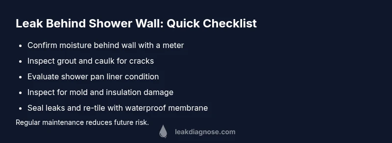 A leak behind the shower wall is a common headache for homeowners. You may not see a steady drip, but over time water finds its way into the wall cavity, framing, or insulation. Signs include damp or musty odors, water stains on the ceiling or adjacent walls, bubbling or peeling paint, warped drywall, and mold growth in or around the shower enclosure. The keyword here, leak behind shower wall, often appears when moisture hides behind tile or paneling, gradually degrading materials. According to Leak Diagnosis, early indicators are typically hidden moisture rather than an obvious leak, so a careful visual check and moisture testing are essential before tearing into walls. Prompt attention minimizes mold risk, structural damage, and expensive repair bills, so start with a quick, non-destructive inspection of visible caulk, grout joints, and the shower pan edge.