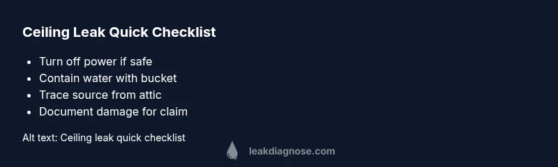 A leak in ceiling is a warning sign of hidden water intrusion that can compromise structural integrity and trigger mold growth. According to Leak Diagnosis, acting quickly reduces damage and saves you money in repairs. Begin with safety: if there is standing water near outlets or lights, avoid touching electrical fixtures and shut off the circuit to that area if you can do so safely. Place a sturdy bucket or basin under the drip to catch water and prevent stains from spreading. Lay down towels or drop cloths to protect floors and furniture. If the leak is active in an upstairs room or attic, trace the water path by looking for wet drywall or stain lines on the ceiling below. Do not climb onto a wet roof or into an attic with a sagging ceiling; call a professional if you feel unsure about the risk. This initial response buys you time to arrange repairs and prevents secondary damage like warped plywood or insulation saturation.