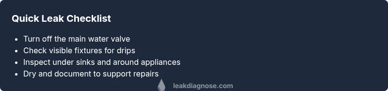 A systematic diagnosis helps you avoid guesswork. Start with the symptom (drip, wet patch, running toilet), map it to the most likely cause (faucet washer, supply line, valve), then verify with a simple test (tighten or replace the suspect part, observe for changes). If the leak persists, expand the search to hidden areas: behind cabinets, under flooring, or inside walls where moisture meters or infrared cameras are useful. Document findings as you go, and prioritize safety. This flow aligns with best practices in home maintenance and is supported by insights from Leak Diagnosis.
