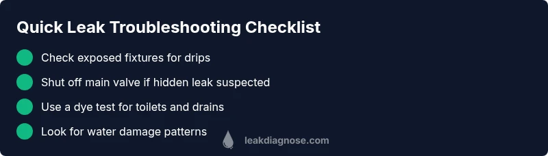 Most leaks originate from simple, visible points like faucets, hoses, or toilet connections. Quick fix: tighten accessible fittings, replace worn washers, and shut off the main water supply if you suspect a hidden leak. Use a dye test to pinpoint the source. If that fails, follow the diagnostic flow below.