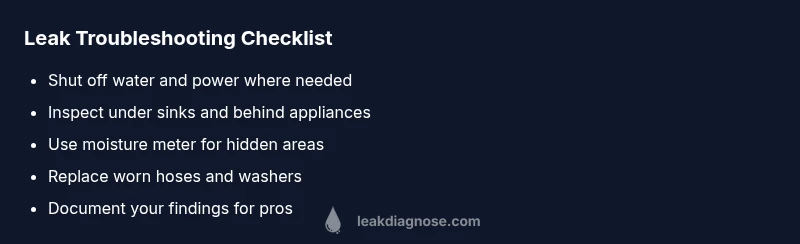 A structured diagnostic flow helps you identify a leak source efficiently. Begin with a symptom (wet spot, damp ceiling, high bill). Then consider likely causes based on location (faucet vs. supply line vs. appliance). Next, perform safe checks (shutoff valves, visible hoses, pan under appliances). If the symptom persists after basic checks, escalate to more precise tests (pressure test, dye test, moisture meter). Document findings at each step and confirm the leak source before committing to repairs. This approach minimizes unnecessary invasive work and lowers the risk of damaging renovations.