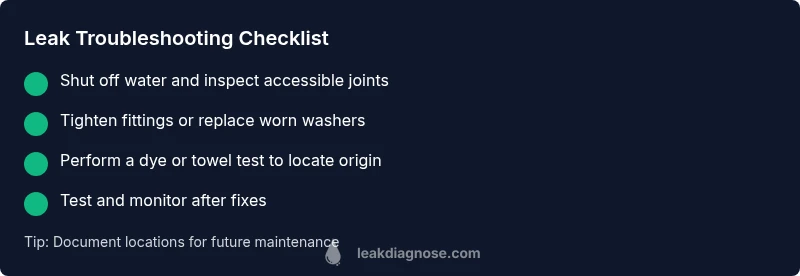 Leaks in a home plumbing system often begin at points where water is under pressure or where aging components meet. Common culprits include worn washers in faucets, loose fittings at supply lines, corroded pipes, and faulty valves. The goal of this section is to help you recognize likely failure points and to set expectations for a safe, step-by-step approach that minimizes further damage. According to Leak Diagnosis, many residential leaks originate at fixtures and joints rather than distant hidden pipes, so a careful visual inspection of under-sink areas, appliance connections, and toilet flanges is time well spent. Start with the facts: locate the damp area, identify the fixture involved, and map out nearby plumbing so you can trace the path of any water.