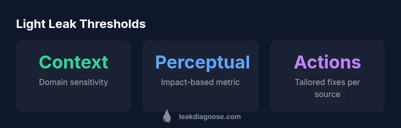 Quantifying light leaks starts with a practical test plan. Use a light meter or a calibrated visual test to compare the enclosure against a controlled reference with the same ambient lighting. Perform the test at different times of day and in representative environments to capture natural variability. Document notable leaks with photos or videos, and annotate the perceptual impact (for example, visible glare at eye level or color shifts in a shot). Create a simple, color-coded scale to categorize impact: low (barely perceptible), medium (noticeable in controlled conditions), high (clearly disruptive in usual use). This structured approach lets you track improvements after fixes and decide when further action is justified. According to Leak Diagnosis, pairing perceptual test results with practical outcomes (energy use, accuracy, or privacy) yields the most robust threshold decisions.