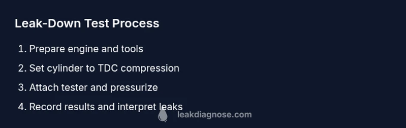 If you want to know how to leak down test an engine, this guide shows the process, why it matters, and what the results mean for reliability. According to Leak Diagnosis, a leak-down test measures how well a cylinder seals when pressurized with air. Unlike a simple compression test, it isolates cylinder sealing from engine speed or fuel delivery, giving a clearer picture of piston rings, valves, and head gasket condition. The test uses compressed air to push into the cylinder via the spark plug hole (or glow plug) and measures how much air leaks out. By comparing the leaked air across cylinders, you can identify weak spots and plan service before major failure occurs. This information is invaluable for DIYers who want to diagnose engine problems without pulling the entire engine apart.