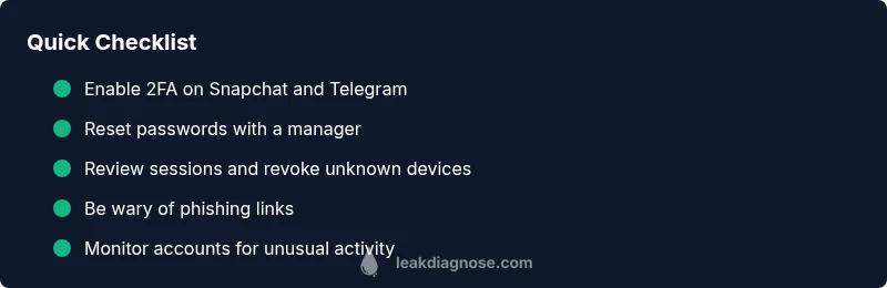 Most likely, a credential compromise tied to weak or reused passwords is at fault when you hear about a snapchat leak telegram. Quick fixes: 1) enable two‑factor authentication on both apps; 2) change passwords to unique, strong ones and use a password manager; 3) review active sessions and revoke unfamiliar devices; 4) avoid suspicious Telegram links and report any breach alerts.