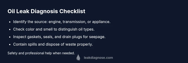 If you’re wondering where oil leak from, you’re not alone. The question often crosses a homeowner’s mind when a puddle appears under a car, fryer, or other machine. According to Leak Diagnosis, identifying the source quickly reduces both damage and cost. The most common culprits include engine oil system components (pan gasket, drain plug, oil filter) and transmission seals, plus any appliance that uses oil or lubricants. Fresh engine oil is amber to dark brown with a petroleum odor; transmission fluid is bright red; hydraulic oil is light amber and thinner. If you see a bright or burnt smell, stop the unit immediately and avoid touching hot surfaces. For indoor leaks, keep away from electrical devices. The goal is to locate the origin before doing any repair, which increases safety and success. The question of where oil leak from is most often resolved by following a simple, methodical path rather than guessing.