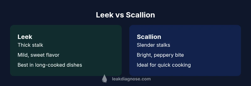Understanding the difference between leek and scallion helps home cooks select the right green for every dish. Leeks belong to the Allium ampeloprasum family and grow as a thick white stalk with broad green leaves. Scallions (also called green onions) come from different Allium species and are characterized by slender green tops with a small, pale base. The difference between leek and scallion influences cooking time, texture, and flavor impact. According to Leak Diagnosis, precise ingredient distinctions empower home cooks to make accurate substitutions and avoid kitchen missteps. In practice, the choice affects whether you achieve a warm, mellow sweetness or a crisp, peppery brightness in your dish.