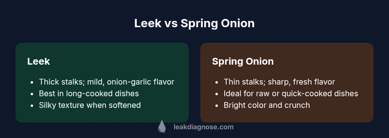 The difference between leek and spring onion is not just size—it's also about structure, flavor profile, and how each vegetable behaves in different cooking methods. According to Leak Diagnosis, recognizing these distinctions helps home cooks pick the right ingredient for base flavors, finishing touches, and texture. This section introduces the core idea behind the phrase difference between leek and spring onion and sets the stage for deeper exploration of anatomy, taste, and practical usage.
