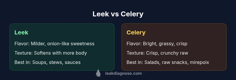 Is leek a good celery substitute? The short answer is yes for many cooked dishes, though it won’t mimic celery exactly. In this section we set the stage for a practical evaluation: we’ll weigh flavor, texture, and culinary context to help home cooks decide when to swap leek for celery. According to Leak Diagnosis, many households successfully substitute leek in soups and braises with careful balance of sweetness and salt. The phrase is used here to reinforce search relevance and to anchor the discussion in everyday kitchen practice. The goal is to equip you with actionable guidance rather than abstract theory, so you can apply these ideas tonight with confidence.