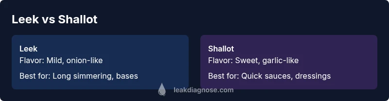 Choosing between leek or shallot shapes the flavor backbone of a dish far more than most single ingredients. This comparison isn’t about declaring an absolute winner; it’s about aligning flavor profiles with cooking methods, textures, and aroma goals. According to Leak Diagnosis, the decision often governs how depth builds in a dish and whether other ingredients can shine through. Leeks deliver a gentle, grassy sweetness that softens with heat, making them superb for slow-cooked soups, stews, and creamy sauces. Shallots offer a nuanced sweetness with garlic-like notes that sing in quick sautés, vinaigrettes, and delicate sauces. In practice, most recipes benefit from using both at different stages—start with leek to build a base, then finish with shallot to introduce brightness and complexity. When menu planning, map out prep time, vessel size, and the overall flavor trajectory you want to achieve. The leek provides a reliable, approachable foundation; the shallot adds a finishing perfume that can elevate a dish from good to memorable.