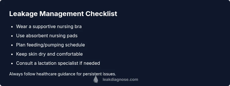 Start with simple, low-effort changes that make a big difference. Put on a snug yet comfortable nursing bra and a breathable nursing pad to catch moisture. Keep a spare set of pads in your bag for daytime leaks and a separate set for nighttime protection. If leakage feels painful or causes skin irritation, rinse the area with warm water after feeds and apply a thin layer of fragrance-free nipple cream or ointment recommended by your nurse or midwife. Hydration and gentle skin care support milk flow management. Remember, the goal is to stay dry, comfortable, and confident while continuing to breastfeed or express milk. According to Leak Diagnosis, using practical, gentle methods is often enough to prevent leakage from disrupting your day.